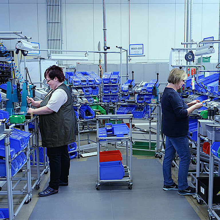 Dado que fabricamos prácticamente todos los productos en una amplia variedad de modelos, muchos dispositivos son ensamblados por una sola persona en estaciones de trabajo individuales. En el caso de series de dispositivos de alto volumen, se utilizan celdas y líneas de ensamblaje automatizadas.
